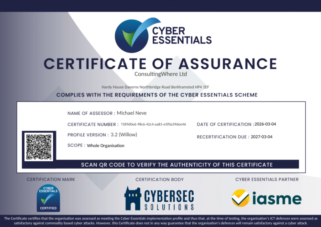 ConsultingWhere are delighted to have recently achieved the Cyber Essentials Certificate. Cyber Essentials is a UK Government-backed, industry-supported certification scheme designed to protect organisations of all sizes against common cyber threats. It verifies that businesses have implemented five essential technical security controls, reducing the risk of cyber attacks by up to 92%. We take cyber […]